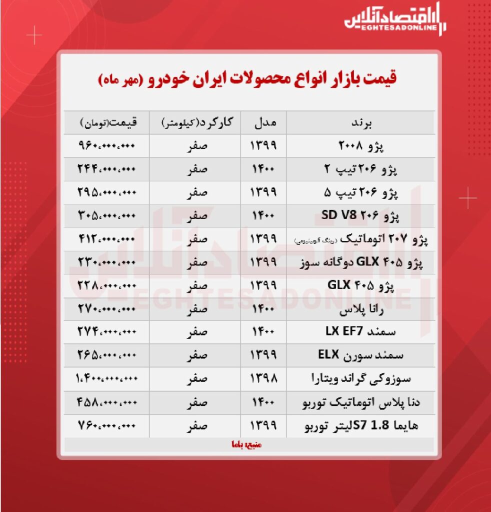 اقتصاد آنلاین – پیام مصطفایی: در جدول زیر قیمت روز محصولات ایران خودرو در بازار آزاد را مشاهده میکنید.